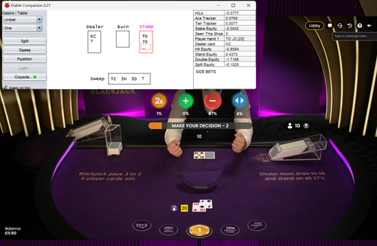 The strength of Diable is proven in real gameplay situations. For example, when facing a tricky hand, most players might follow basic strategy, but Diable goes deeper—calculating precise equity for every possible move. This ensures that every hit, stand, double, or split is the mathematically best choice, maximizing long-term profit.