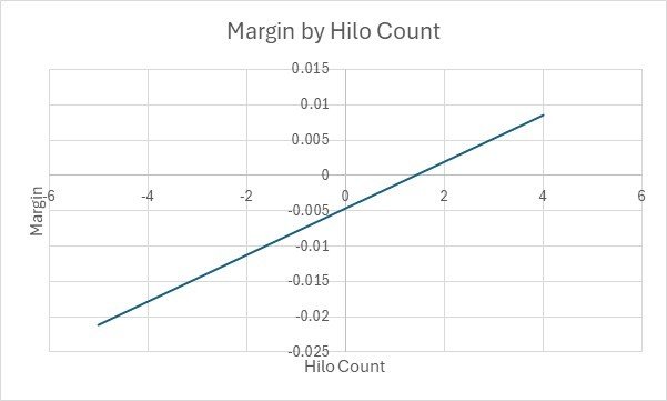 This is the bread and butter of most professional players, who know that you at least break even when the Hilo Count is greater than +1. You add the number of twos, threes, fours, fives and sixes, which count as +1, and subtract the number of tens (including court cards) and aces, which count as -1. The sevens, eights and nines are ignored. You then divide by the number of decks remaining to get a true count. This is not a perfect measure, but without computer assistance is about the best you can do. Let us see a graph of the advantage for the player: