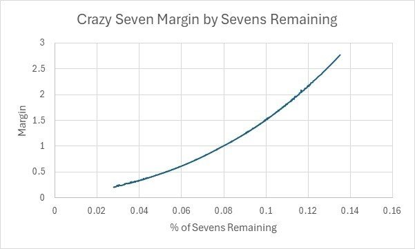 So, the cut off point for making the bet is when the percentage of sevens is above 8%. It will take you a bit of practice to work out the percentage of sevens remaining, but you can usually see at a glance if it is not high enough. So, if eight sevens have gone and 120 cards have been dealt, then there are 24/296 remaining, which is a little over 0.08 and worth a bet of 1. If it is 0.09, then bet 2, 0.1 you can bet 3 etc. Add 1 for each percent advantage you have.