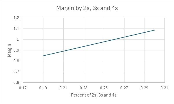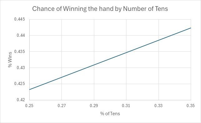 It is interesting to compare the chance of winning the hand (as opposed to getting the highest result) using the Hilo Count. If you play basic strategy, you win about 43% of hands, and the 3:2 payout for Blackjack and the opportunity to double or split, elevates your effective wins to about 49.7%. However, when there are more tens in the deck, you win more often, and also get Blackjack more often. The chance of a win by the number of tens is as follows: