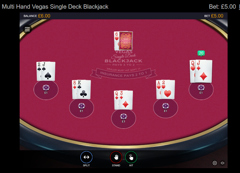 Single deck blackjack is the simplest form of the game and offers a house edge which is smaller than games with multiple decks. I did not find any single-deck games using the increasingly popular live-dealer method in which the cards are dealt with a shoe and shuffled in full view of the players. This is partly because the cards would have to be shuffled after each hand, or the player woud have a clear advantage, and this takes time. Secondly, it requires a dealer all the time which costs money. Playing more than one deal without a shuffle gives the player a significant advantage.