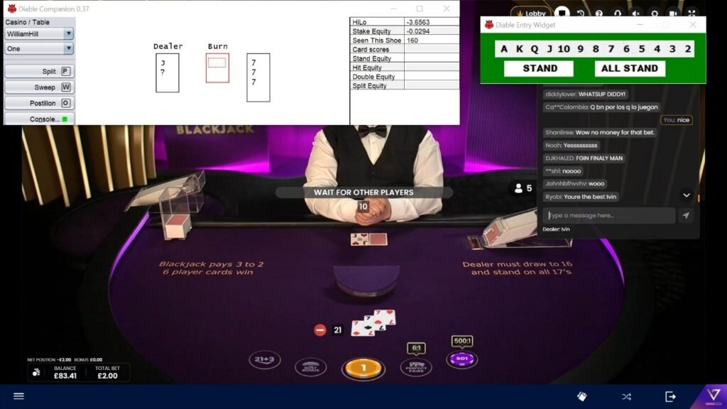 So, you can see from the screen that the player just had to enter the four cards dealt using the console which sits nicely on top of the casino. Very easy using the widget on the right. The drop down menus on the top left give the casino, and game. There is an option to split, which was available on 77 but not exercised as HIT was the better choice. Sweep is pressed when the dealer hand is complete. Postilion is pressed when the cutting card appears and a new shoe is due. Console should be green, showing a connection to the server. If this is lost, the program will revert to basic strategy! This button also allows the player to set the bankroll and the number of turns to miss when there is no advantage. Burn is important. It is used for cards taken by other people. Many games are single seat with multiple players and some people will split sevens and receive other cards which should be entered to get the most accurate plays. Currently the player is told to wait for other players, so there must have been some splitters, 5 it would seem. All very easy, and there is a manual if you get stuck